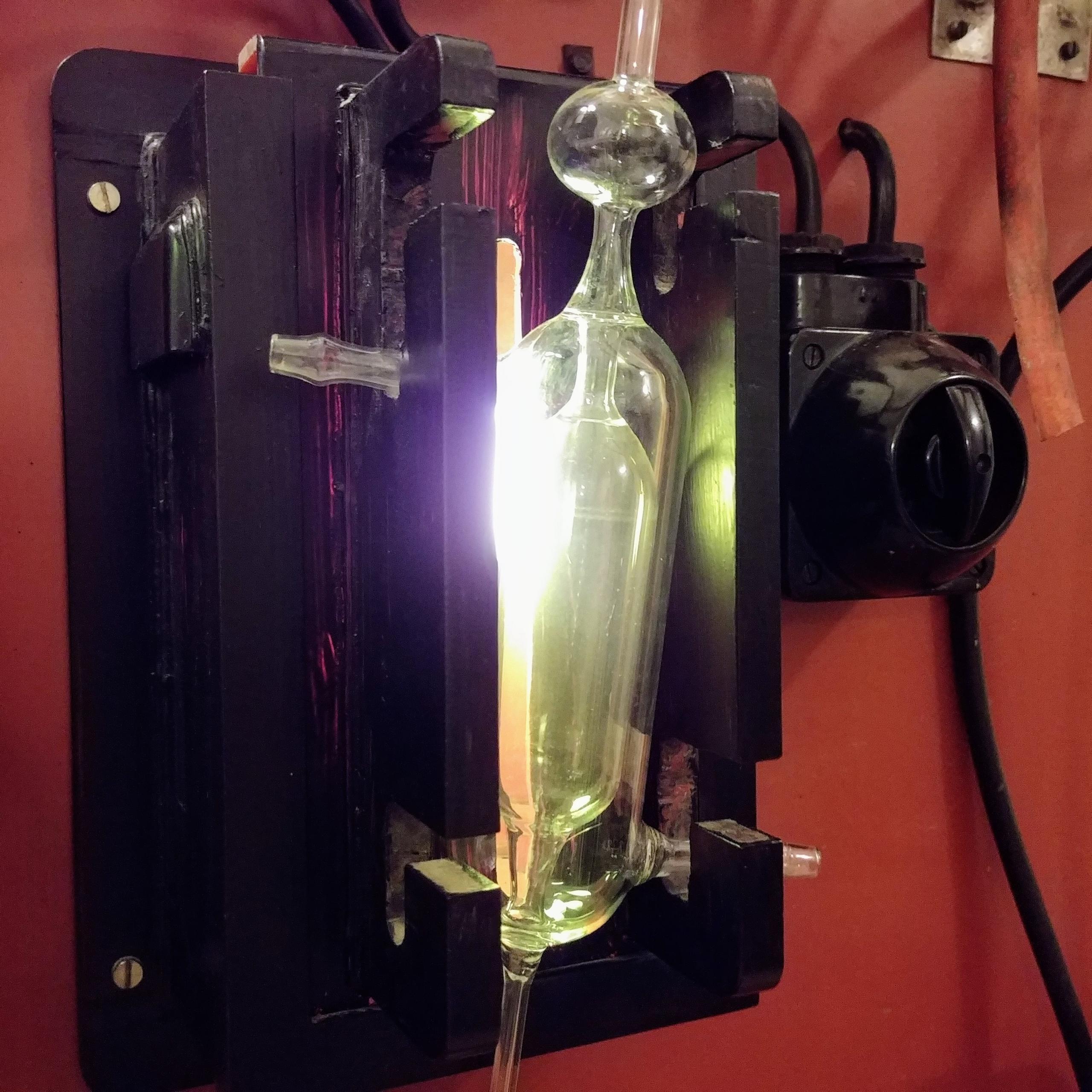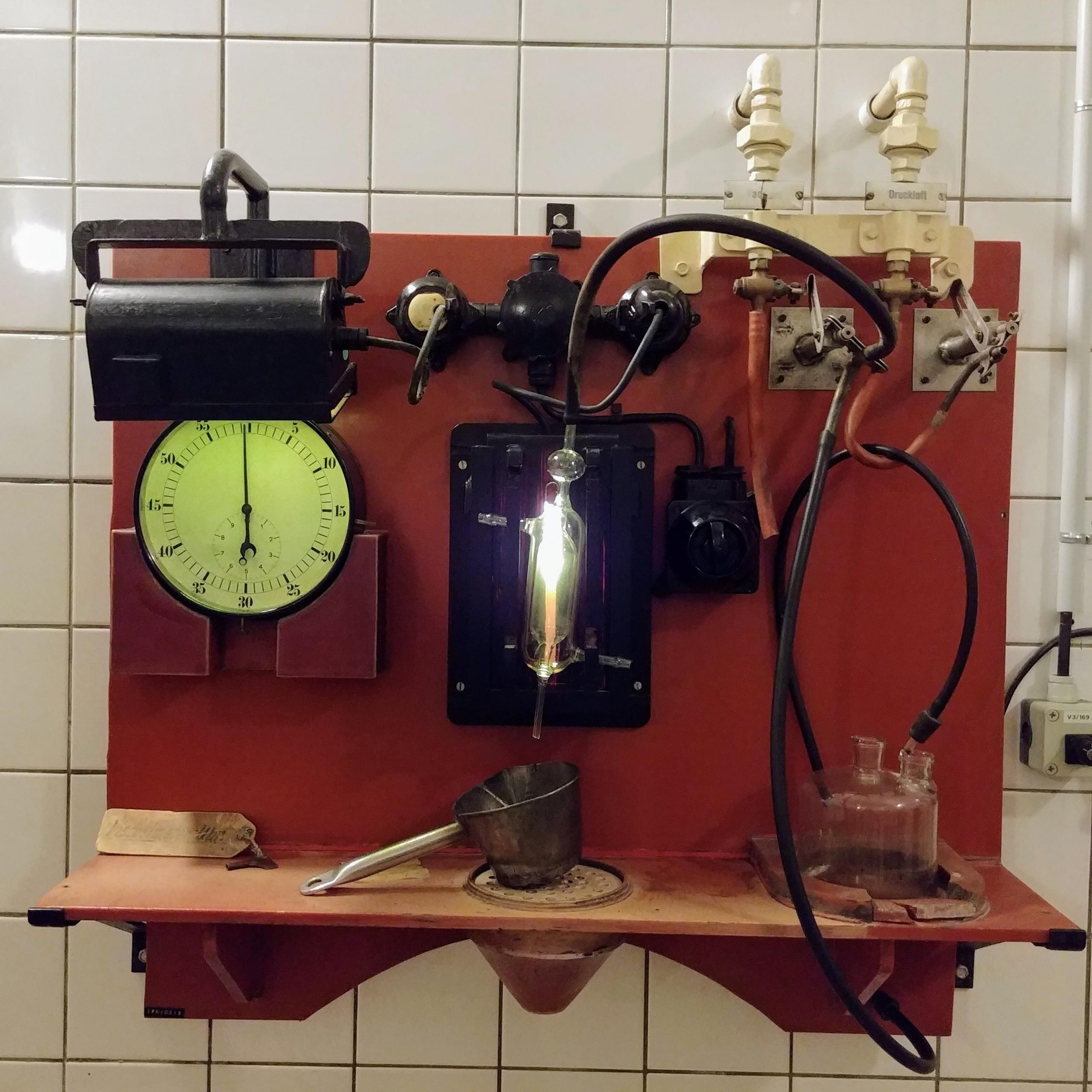 Während heute vornehmlich elektronische Viskosimeter zum Einsatz kommen, bietet unsere Ausstellung eine analoge Variante. Die Probemenge fotografischer Emulsion wird mit Hilfe eines Vakuums durch das Gerät getrieben und die benötigte Zeit für den Durchlauf gemessen. Wichtig ist der mittig angebrachte Durchlaufkolben mit der doppelten Umkapselung. Während die fotografische Emulsion durch den inneren Raum gepresst wird, nutzen wir die beidseitigen Anschlüsse am Kolben, um heißes Wasser mit derselben Temperatur unserer Emulsion durchlaufen zu lassen. So wird gewährleistet, dass die Gelatine in der Emulsion sich nicht abkühlt, die Viskosität zunimmt und das Testergebnis verfälscht wird.